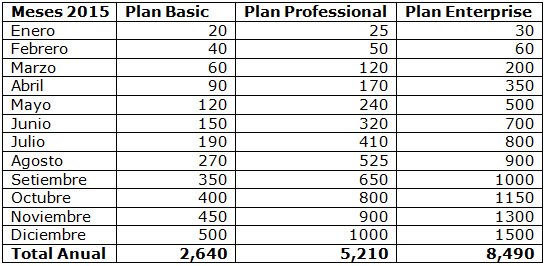 Aseguramos sus ventas del año 2015, Usted decide cuanto desea vender, los planes regulares garantizan miles de contactos anuales: 2,640 en el Plan Basic, 5,210 para el Plan Professional y 8,490 contactos en Plan Enterprise.